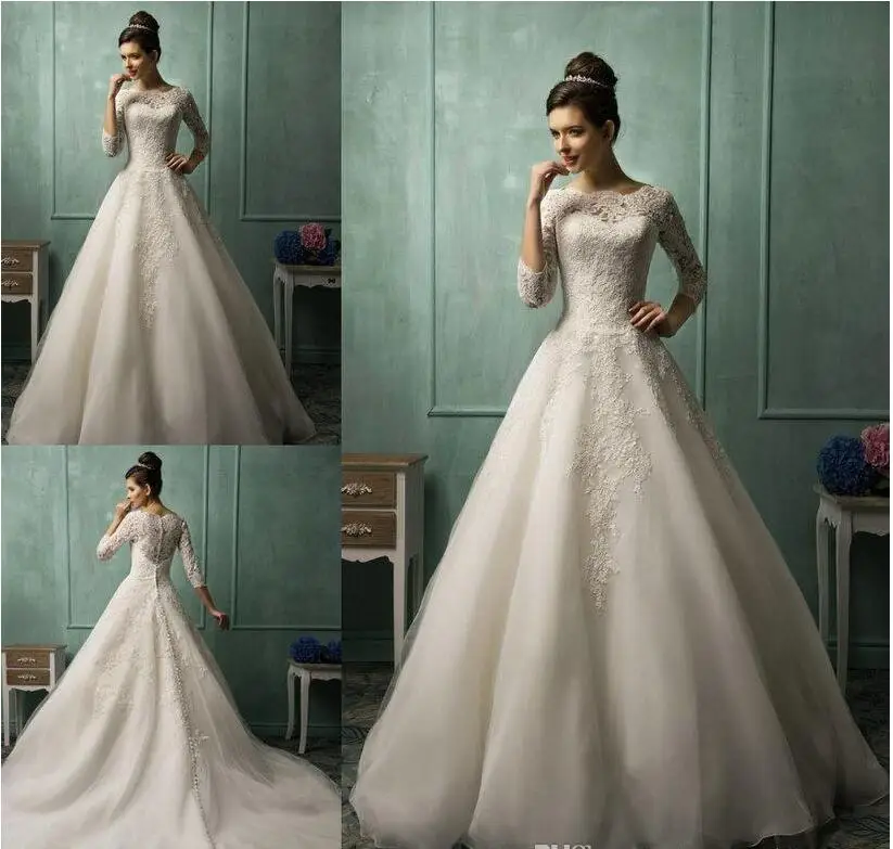 2015 Spring Vintage Wedding Dress 3 4 Sleeves Organza Scoop Neck Chapel Train Modest Weddi Amelia Sposa Wedding Dress Wedding Dresses Lace A Line Wedding Dress
